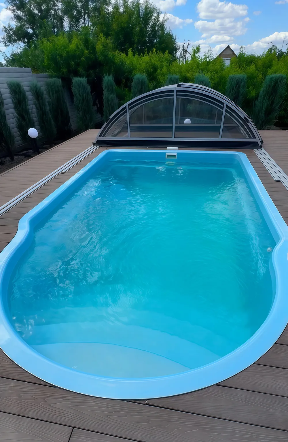 Стекловолоконные композитные материалы, использованные при создании чаши в заводских условиях, гарантируют будущему владельцу прочность и долговечность конструкции. Бассейн не выгорает на солнце под открытым небом и устойчив к образованию льда при замерзании воды зимой. Отсутствие теплопроводности у стен чаши снижает расходы пользователя на электричестве, а гладкая поверхность бассейна изнутри не допускает налипание грязи и разведение бактерий.